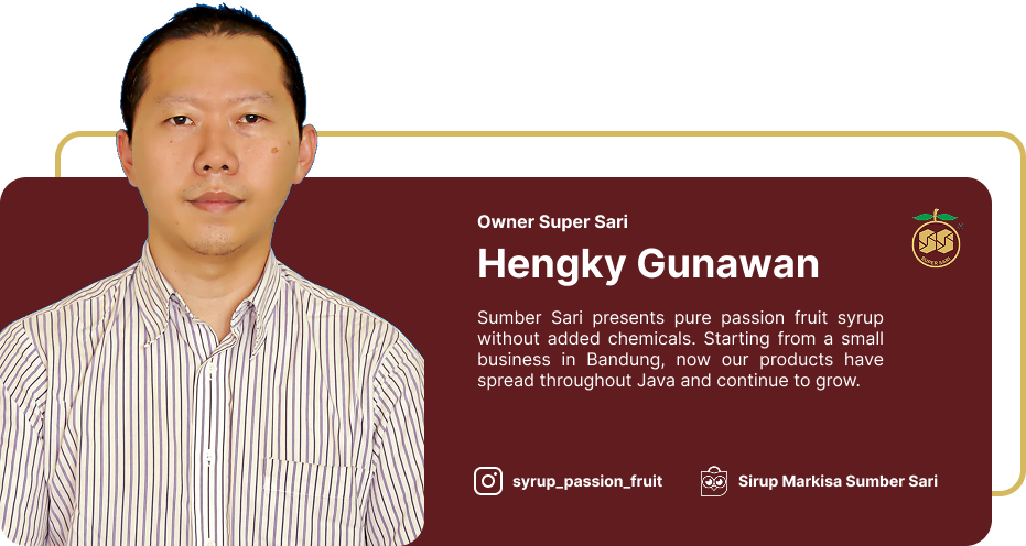 Since 1990, Sumber Sari presents pure passion fruit syrup without added chemicals. Starting from a small business in Bandung, now our products have spread throughout Java and continue to grow. We are committed to working with local farmers and presenting quality healthy drinks from selected natural ingredients.